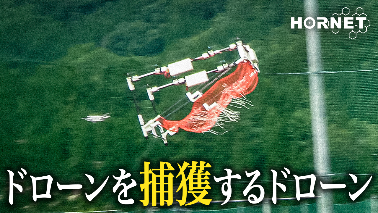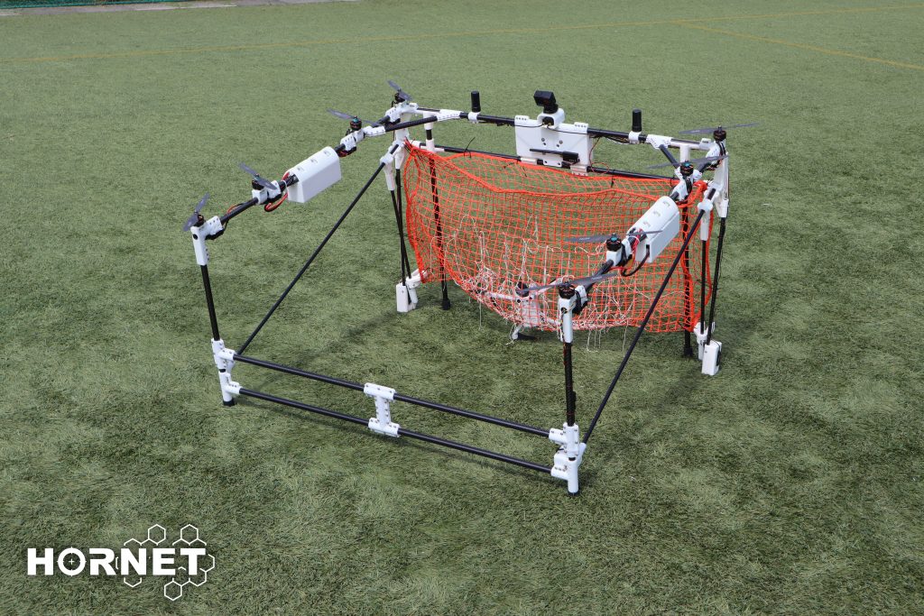 「HORNET(ホーネット)」は機体に備え付けたネットで不審な飛行体を捕獲し、回収までできる大型ドローンです【特許出願中】